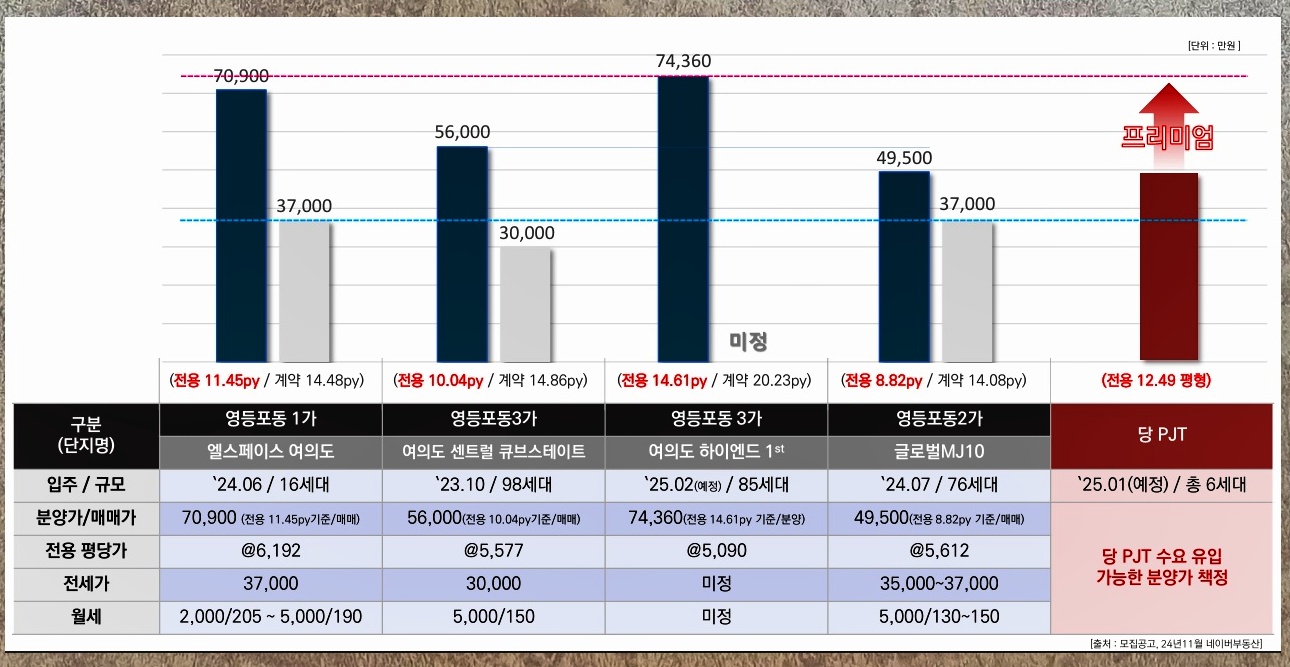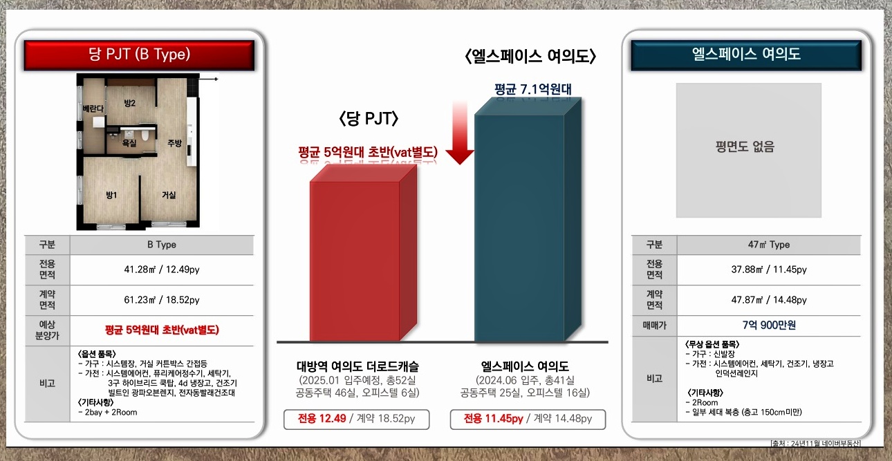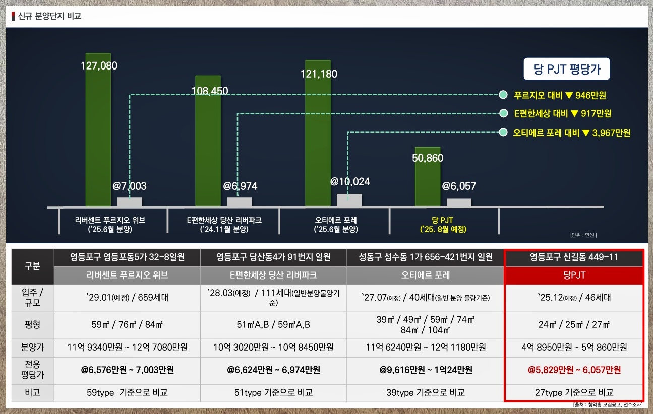 신규 분양단지를 비교해 보면 푸르지오 대비 946만 원, e편한세상 대비 917만 원, 오티에르 포레 대비 3,967만 원까지 평당가가 저렴한 상황입니다.