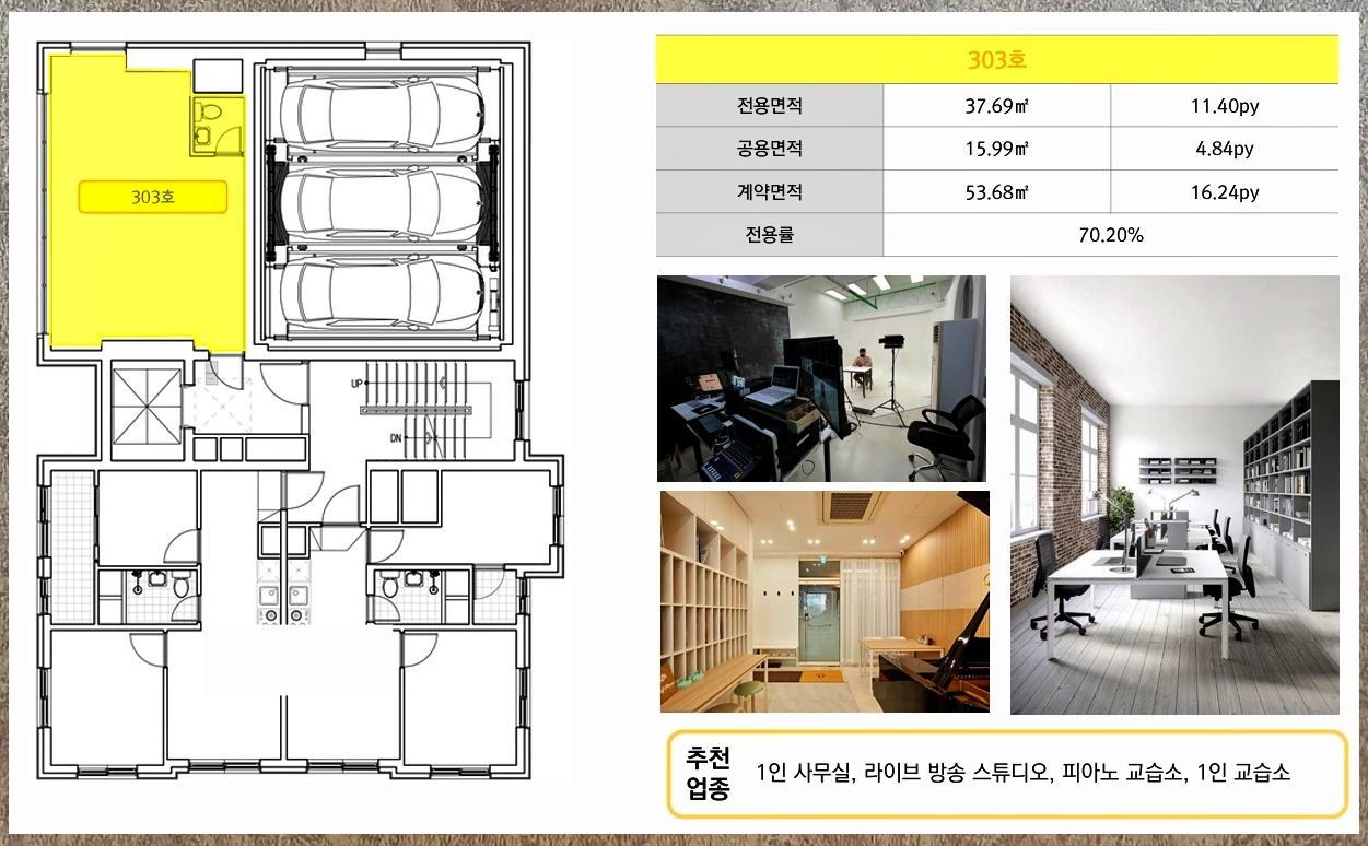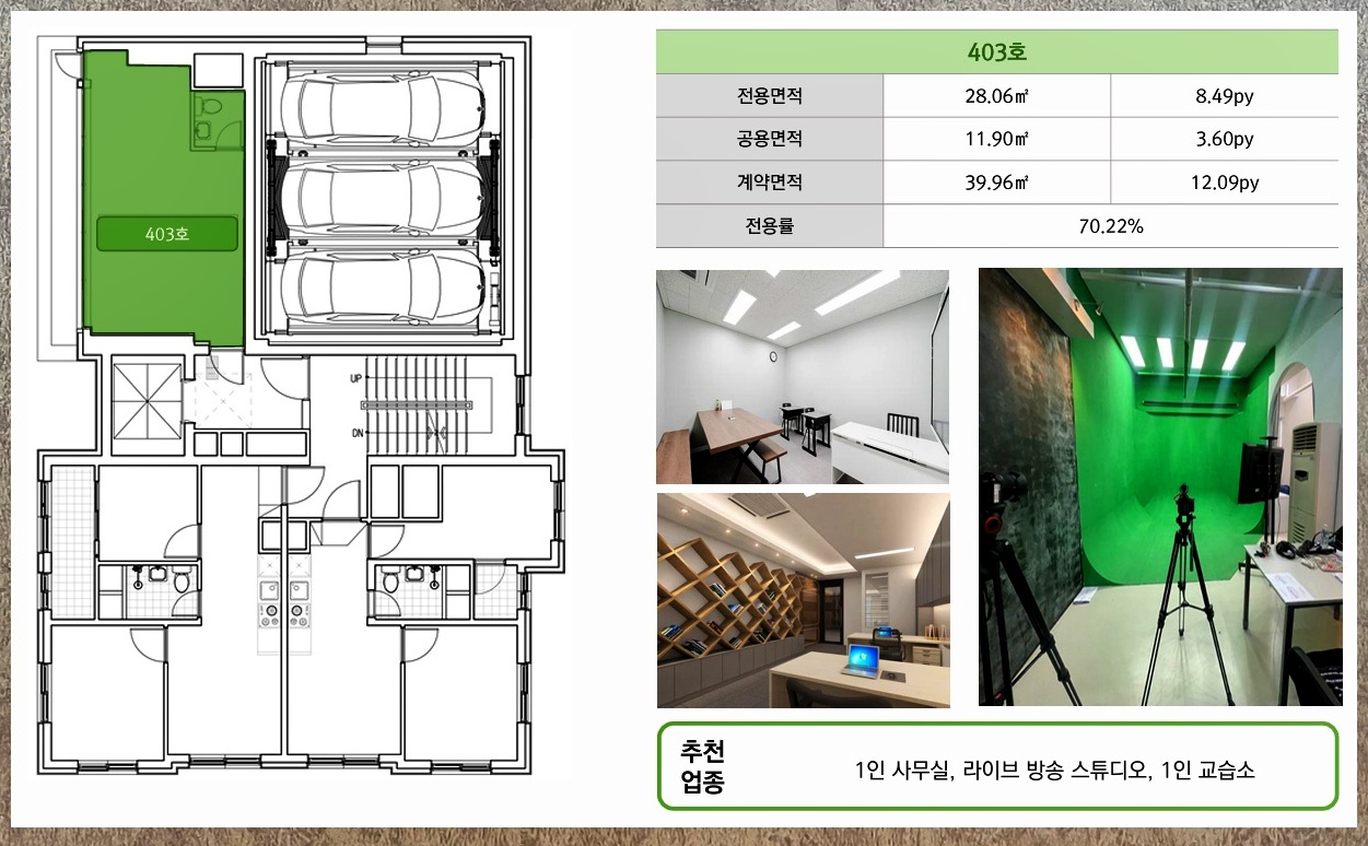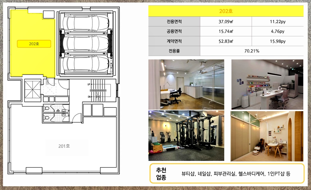 202호 전용면적, 계약면적입니다. 추천 업종은 뷰티숍, 네일숍, 미용실, 피부관리실 등입니다.