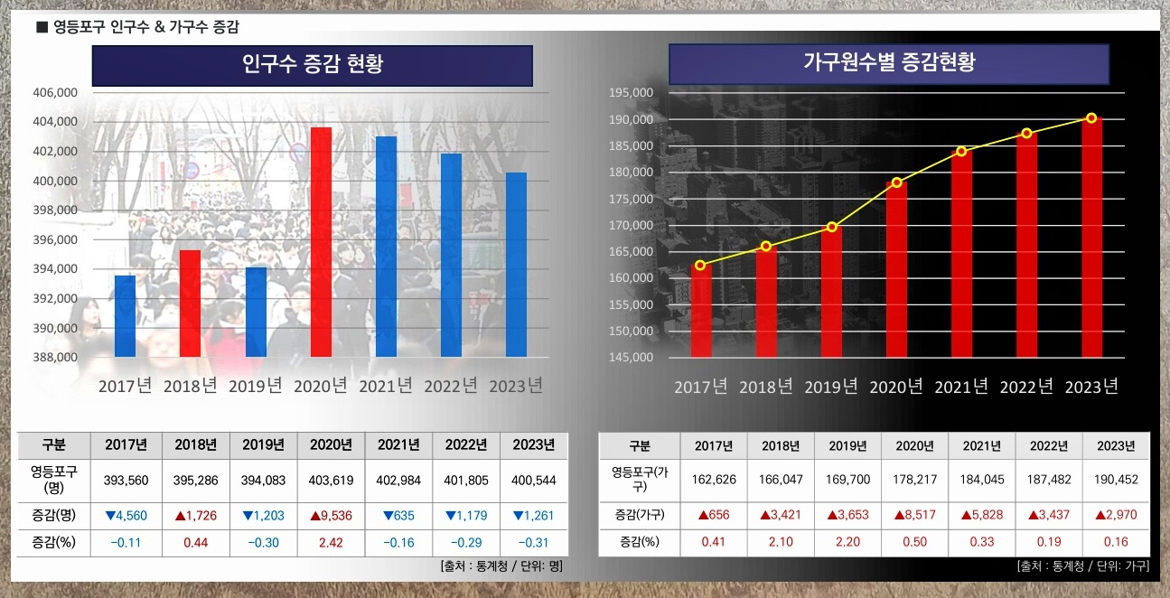 영등포구 2020년부터 인구 3,075명 감소 / 가구수 20,752가구 증가했습니다. 1~2인 가구의 경우 지속적으로 증가하여 당 아파트 2룸형 구조 수요층은 충분할 것으로 평가받습니다.