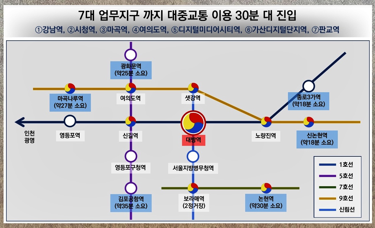 대방역에서는 강남역까지 27분, 판교역 38분, 서울역까지 17분, 마곡역 30분, 가산디지털단지역까지 22분, 여의도역까지 7분대로 대중교통 이용 시 7대 업무지구까지 30분대 도착이 가능합니다.