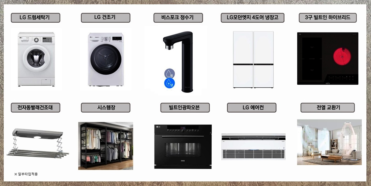 풀옵션 LG드럼세탁기, LG건조기, 비스포크 정수기, LG모던엣지 4도어 냉장고, 3구 빌트인 하이브리드, 전자동빨래건조대, 시스템장, 빌트인광파오븐, LG에어컨, 전열교환기 등 무순위 사전 접수 이벤트 진행 시 발코니 확장비&옵션 1,900만 원 상당 무상 혜택을 드리고 있습니다.